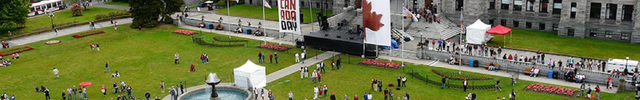 - Thousands of participants wearing red or white T-shirts gather on the Legislature lawns in Victoria to create a living Canada flag for Canada Day festivities. (Ken Kelly/DVBA handout)